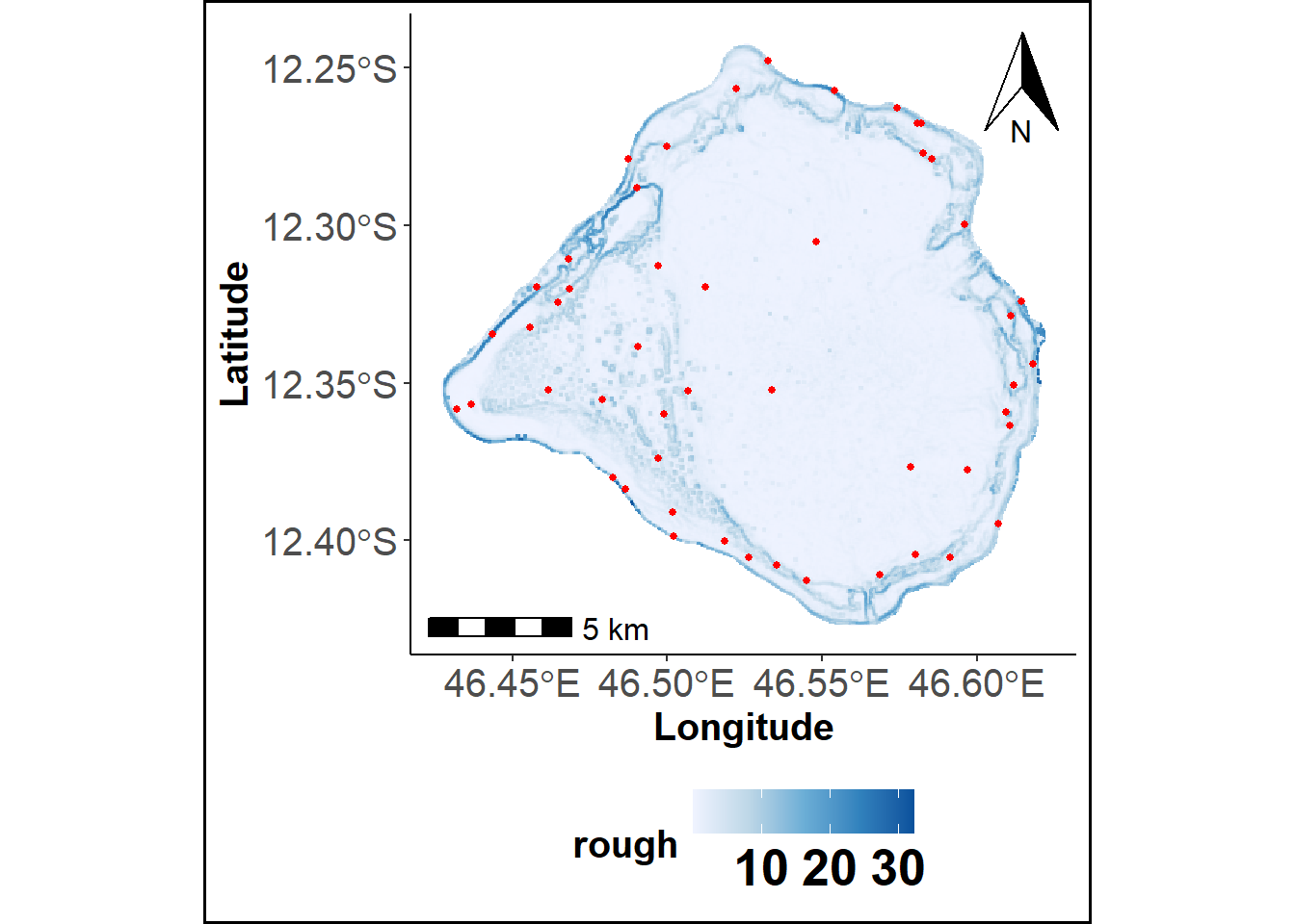 scale_fill_gradientn("Rough", colours = RColorBrewer::brewer.pal(n = 5, name = "Blues"), na.value = "gray")+